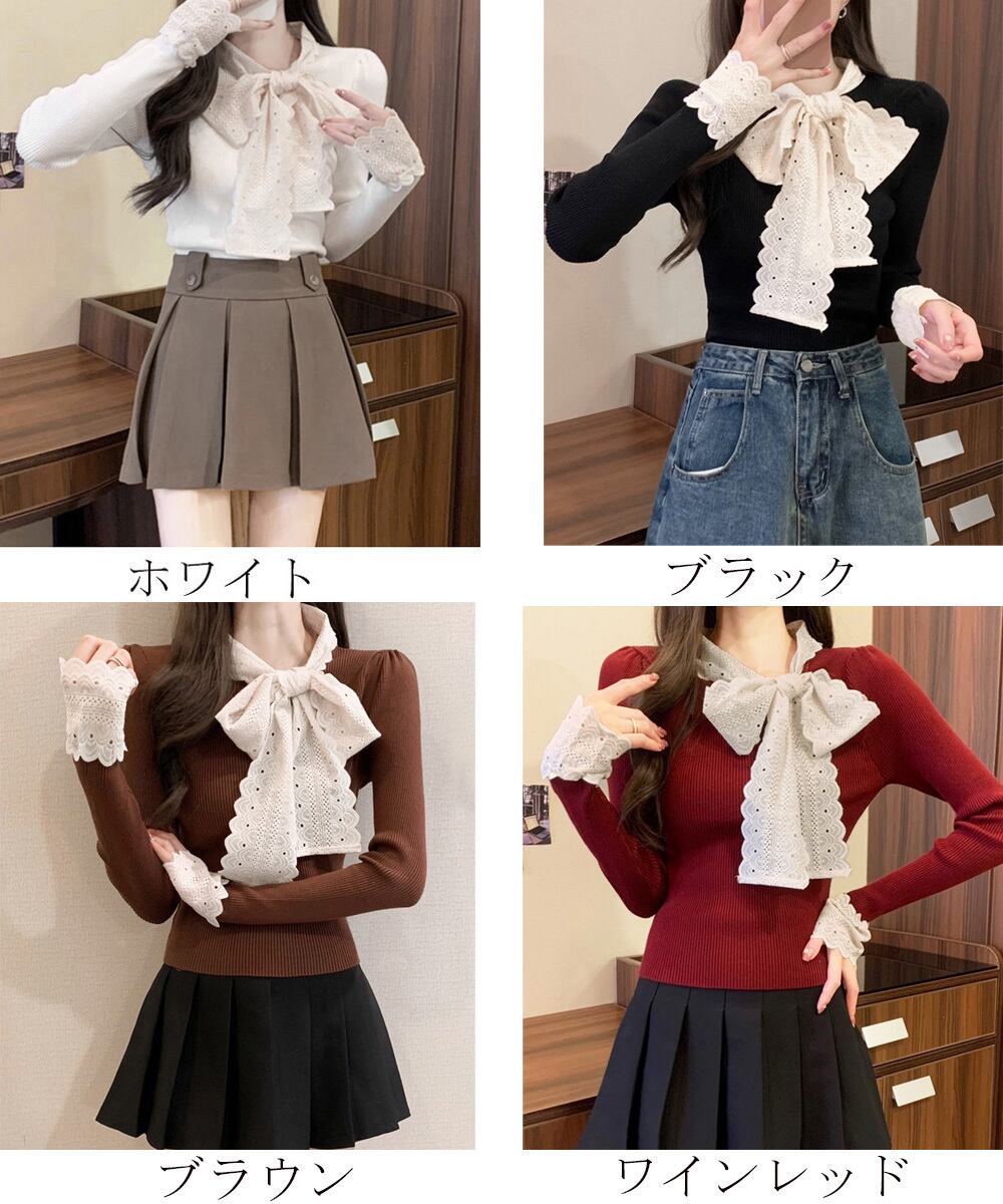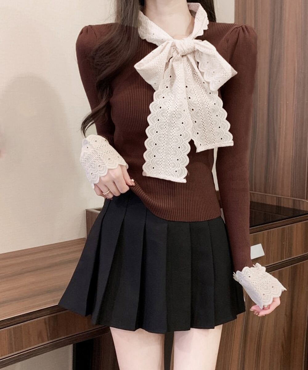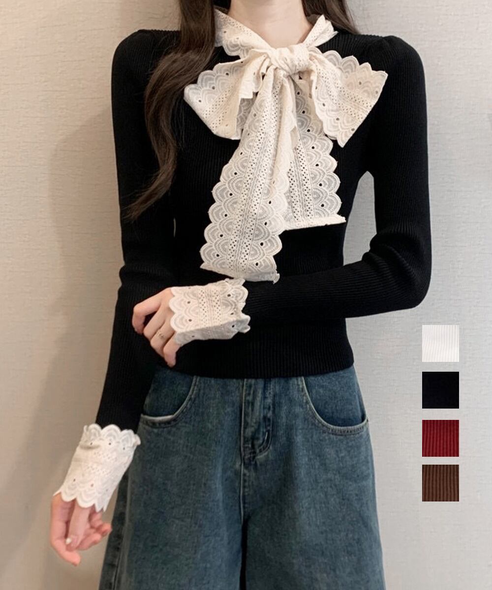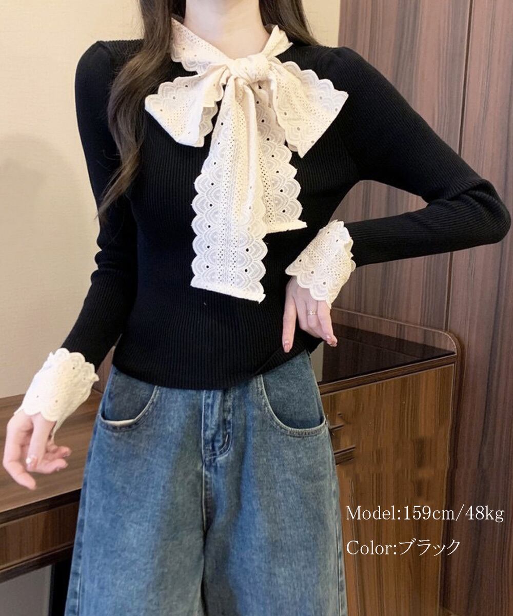 刺しゅうレースのボウタイデザインで可愛さをUPするニットトップス