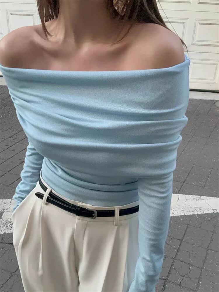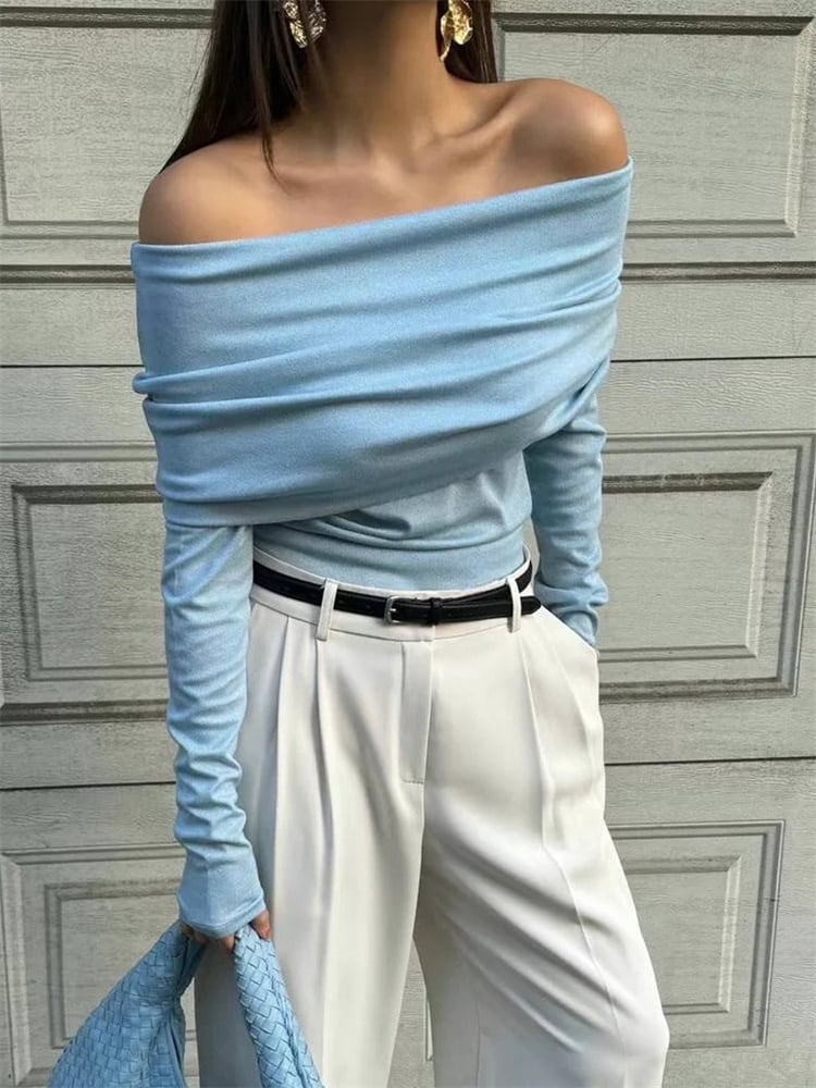 トップス 欧米風 一言の肩 デコルテ 着やせ スリム ニットトップス