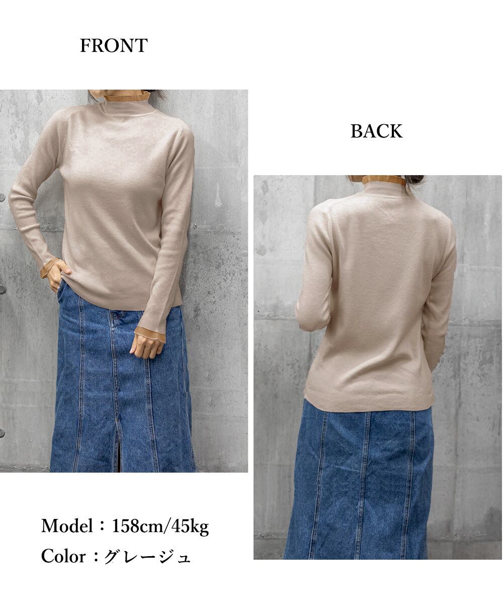 細リブで縦にすっきり、襟と袖口に施されたメロウフリルが大人可愛いハイネックニットトップス