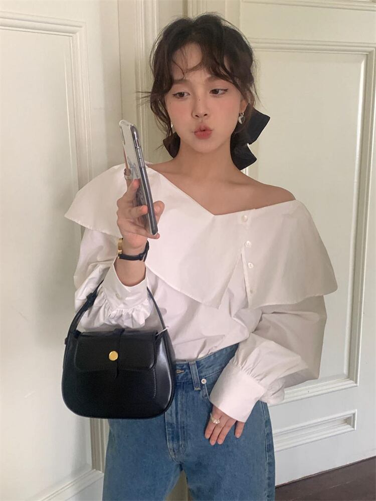 斜めボタン フリル Vネック オフショルダー ゆったりする 上着 sweet系 シャツ ブラウス