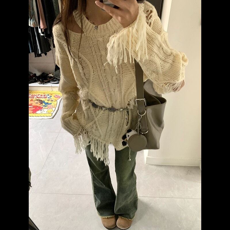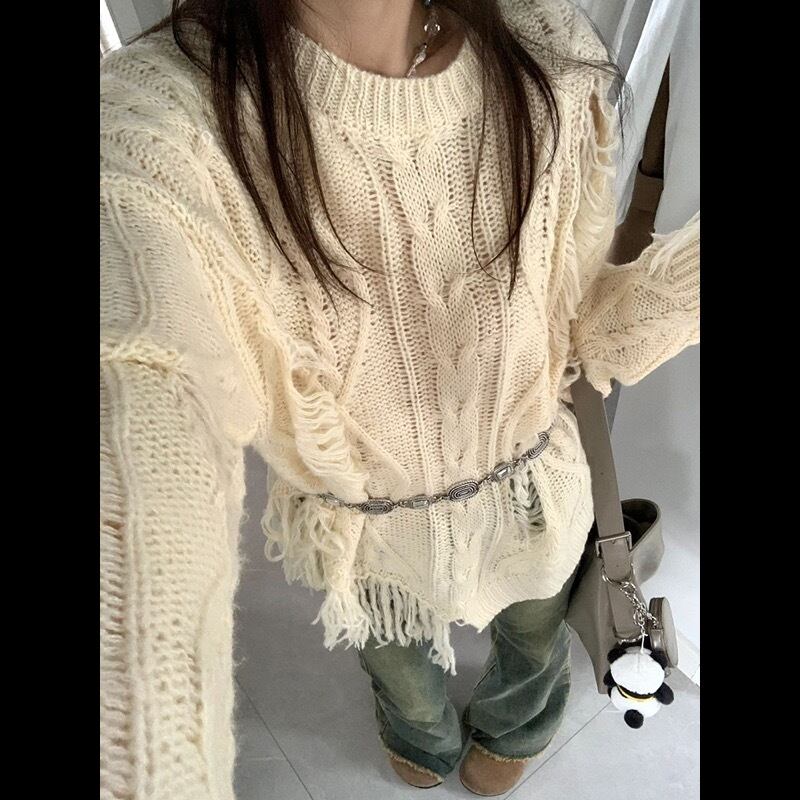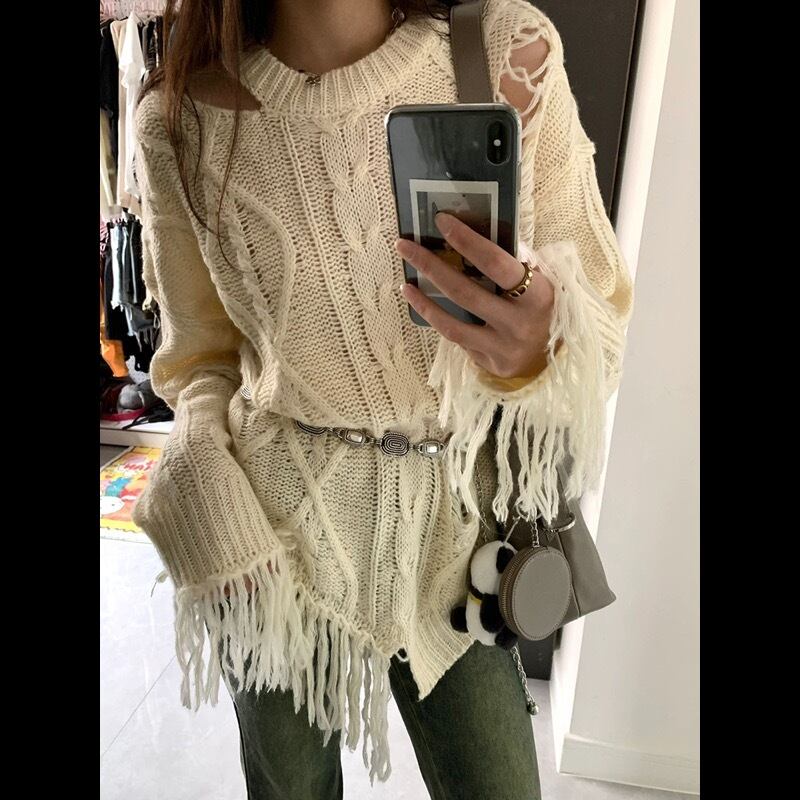 トップス ニット セーター 毛糸 ダメージ加工 長袖 フリンジ タッセル レディース