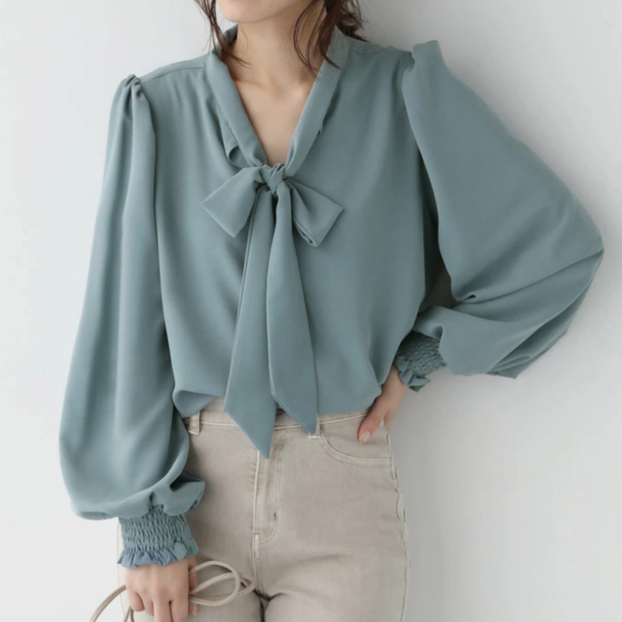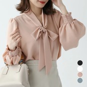 タイリボン 長袖 シャツブラウス タイネック 大人女性 無地 パフスリーブ 通勤 就活 着やせ 韓国 春夏服 きれいめ
