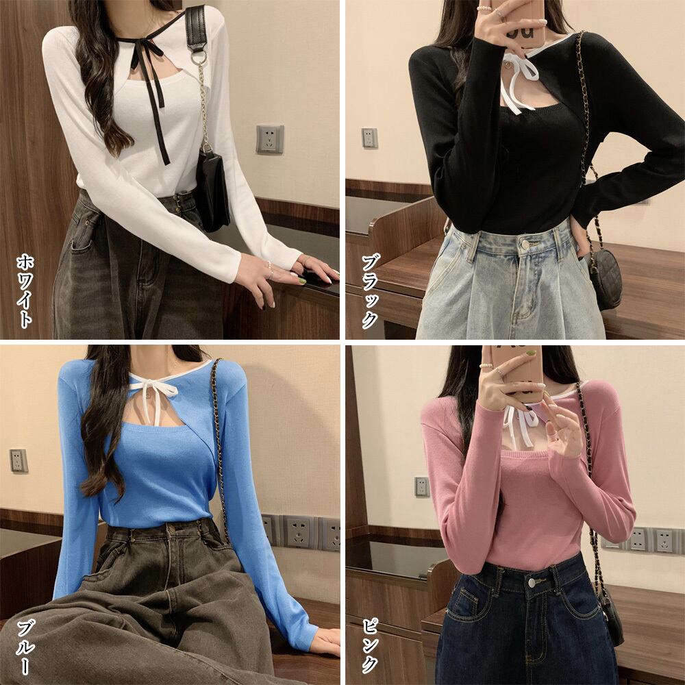 胸元カットトップス 長袖無地ニットソー ニットインナー韓国