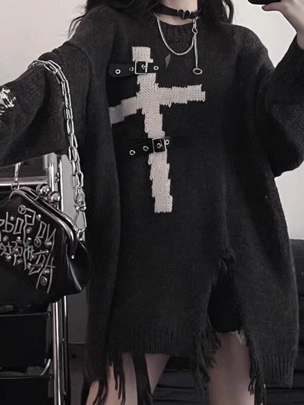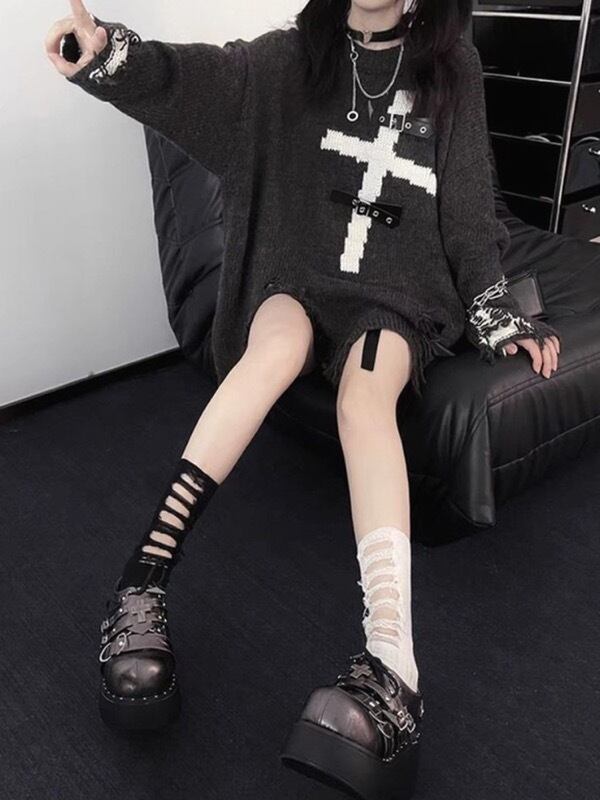 トップス ニット セーター 毛糸 ダメージ加工 パンクファッション レディース
