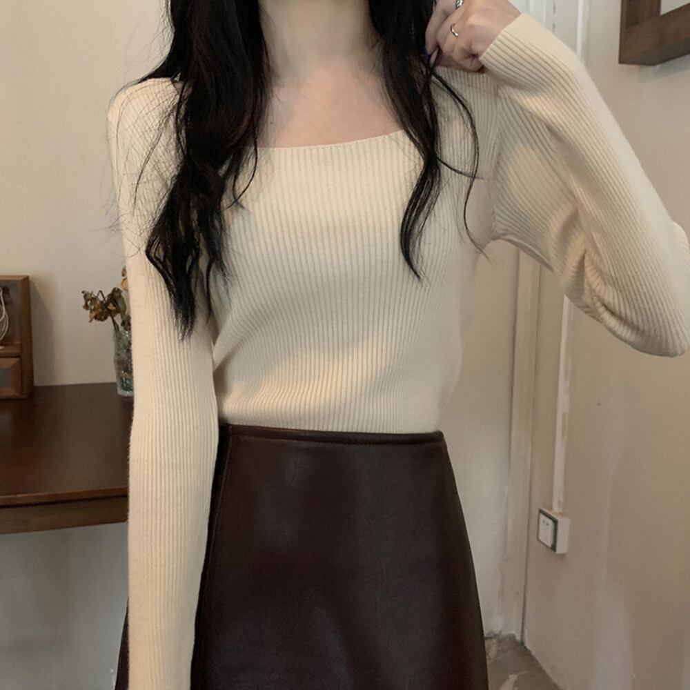 シンプル長袖ニット 着やせ リブニット 女性ニットソー無地