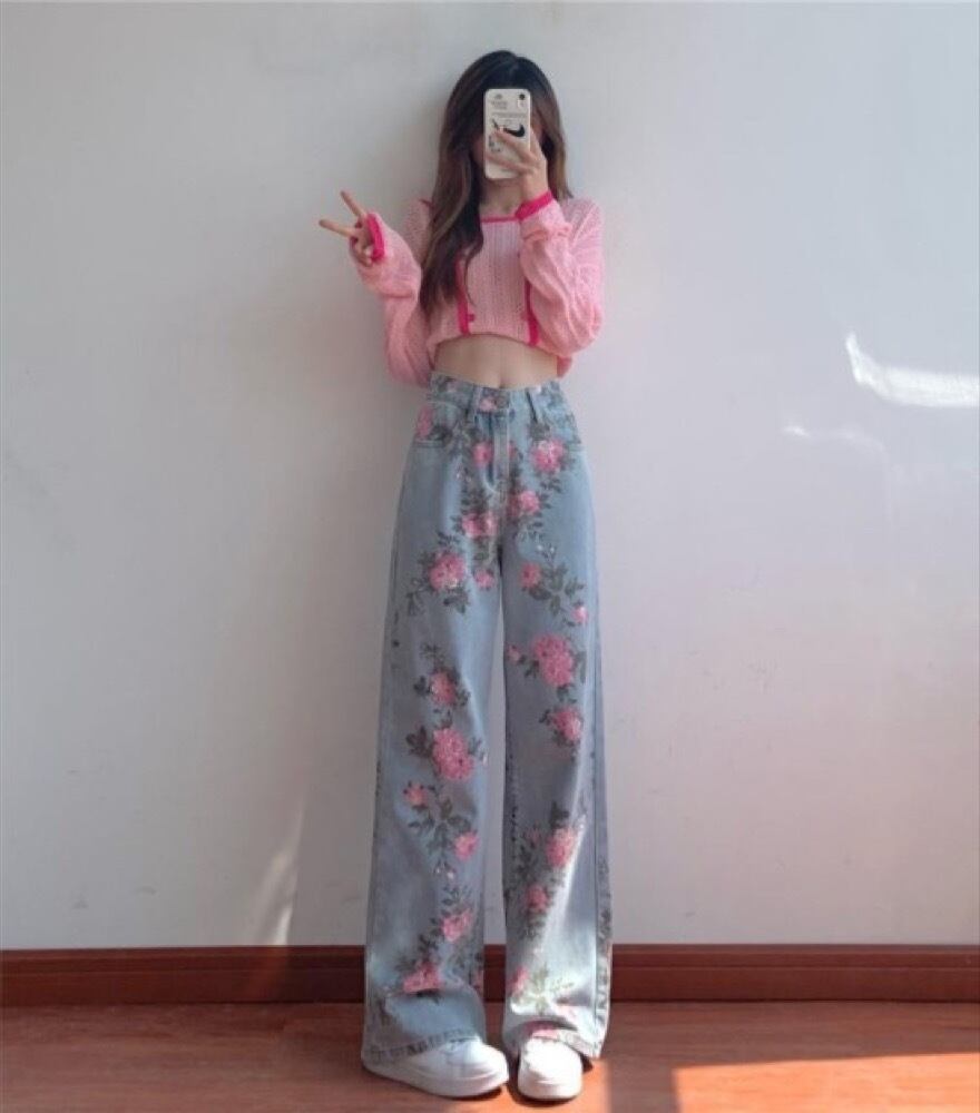新作 パンツ ボトムス デニム ジーンズ ハイウェスト ストレート ゆったり プリント 花柄 レディース