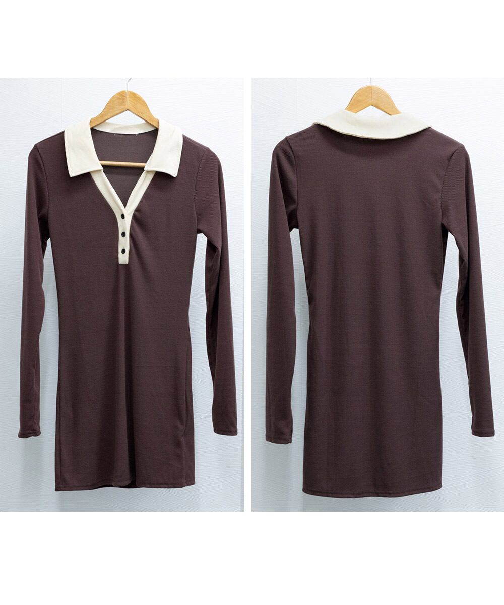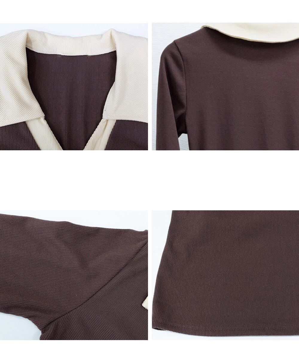 ポロネックミニワンピ 女性らしい Vネック レトロっぽ 柔らか 長袖 ポロ襟 セクシー おしゃれ ショート丈 ワンピース