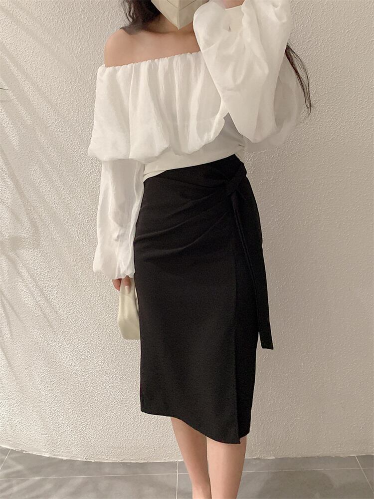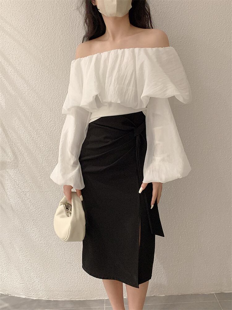 週末に着たい服 自社生産 トップス 一字襟 ランタンスリーブ 長袖 修身 スリム Tシャツ 上着 ゆったりする
