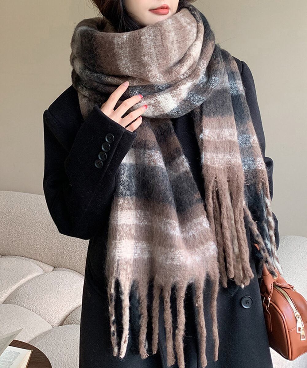 厚手の素材で作られており、ふんわりとした肌触りが良く、首元をしっかりと温めてくれる大判マフラー
