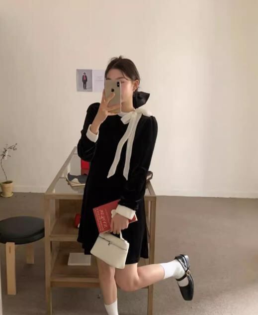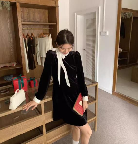 2024春秋新作 女 レディース ハイウエスト 長袖 ベロア ミニ ワンピース ドレス 台型スカート