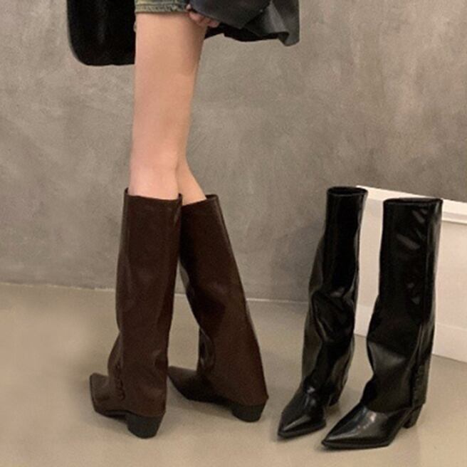 トレンド 人気 ワイドシャフトブーツ ポインテッドトゥ ロングブーツ 黒 ブラック 脚長