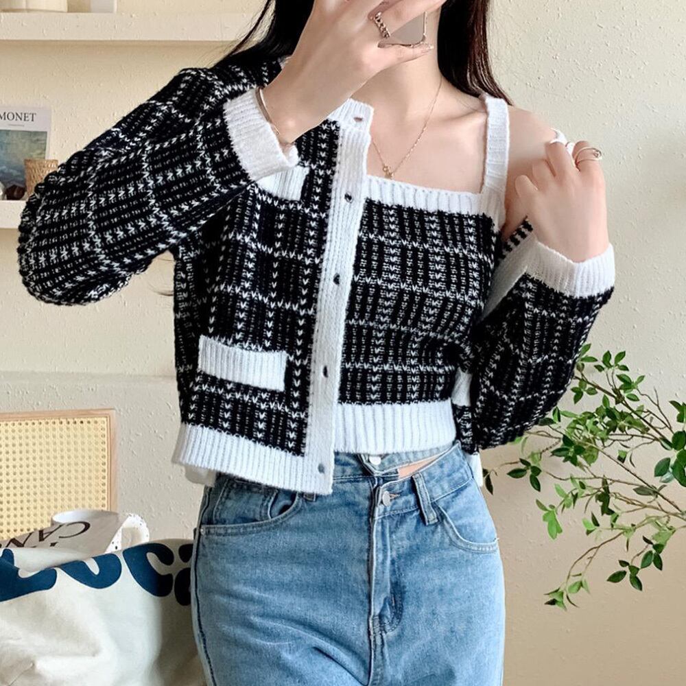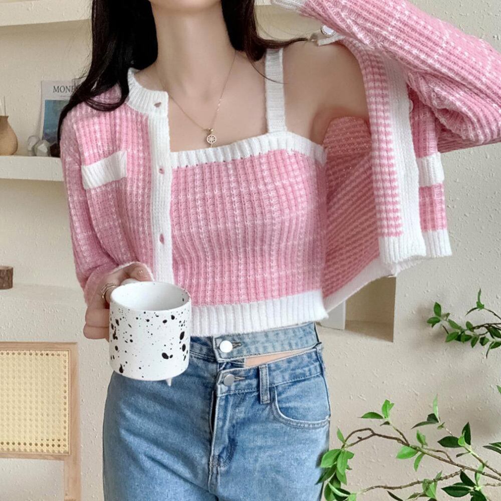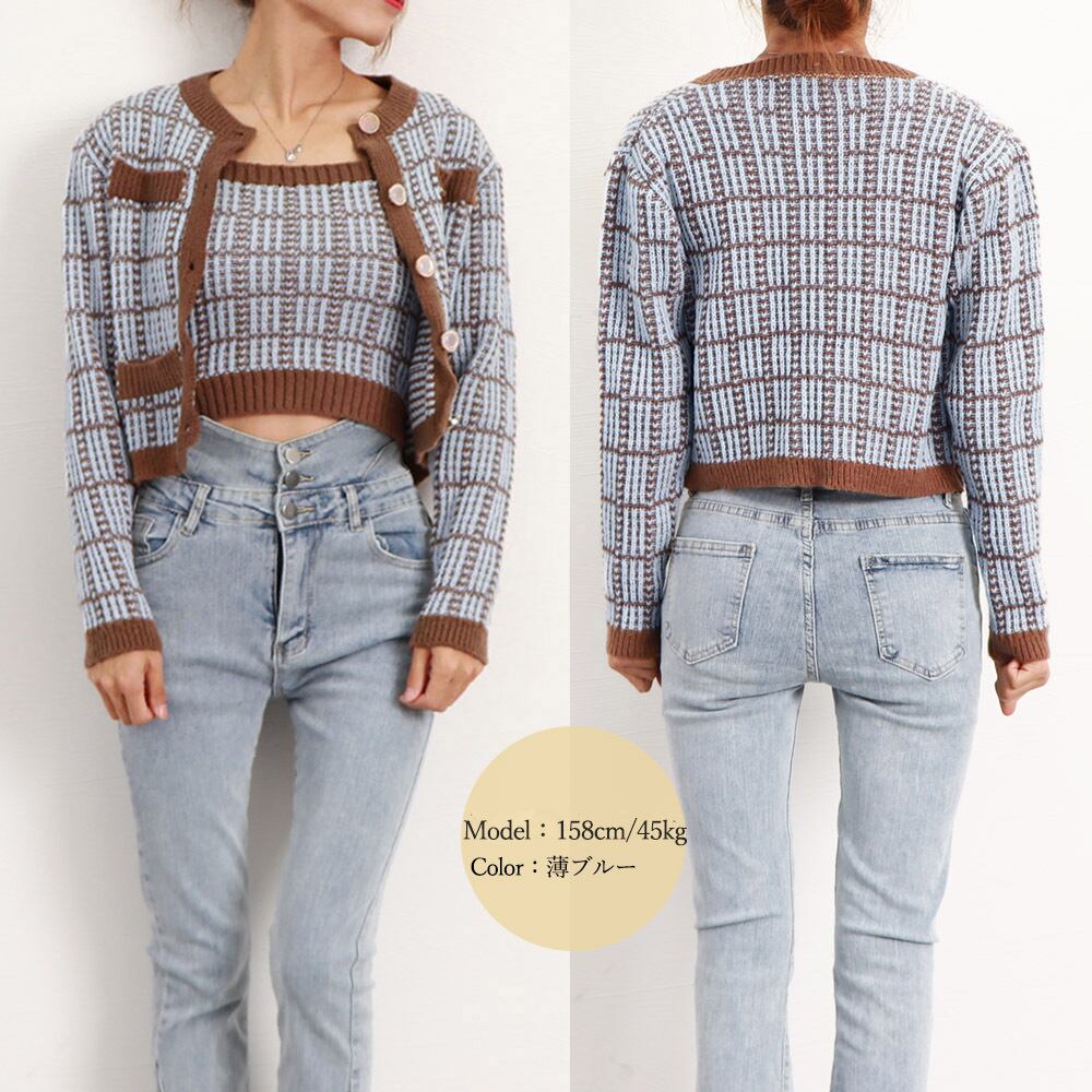 ショート丈 ニットトップス レディース セットアップ 前開き カーディガン おしゃれ キャミソール セクシー ニットソー