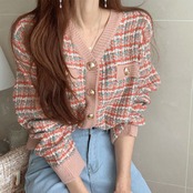 ツイード風デザインの甘めなVネックチェック柄ニットカーディガン。