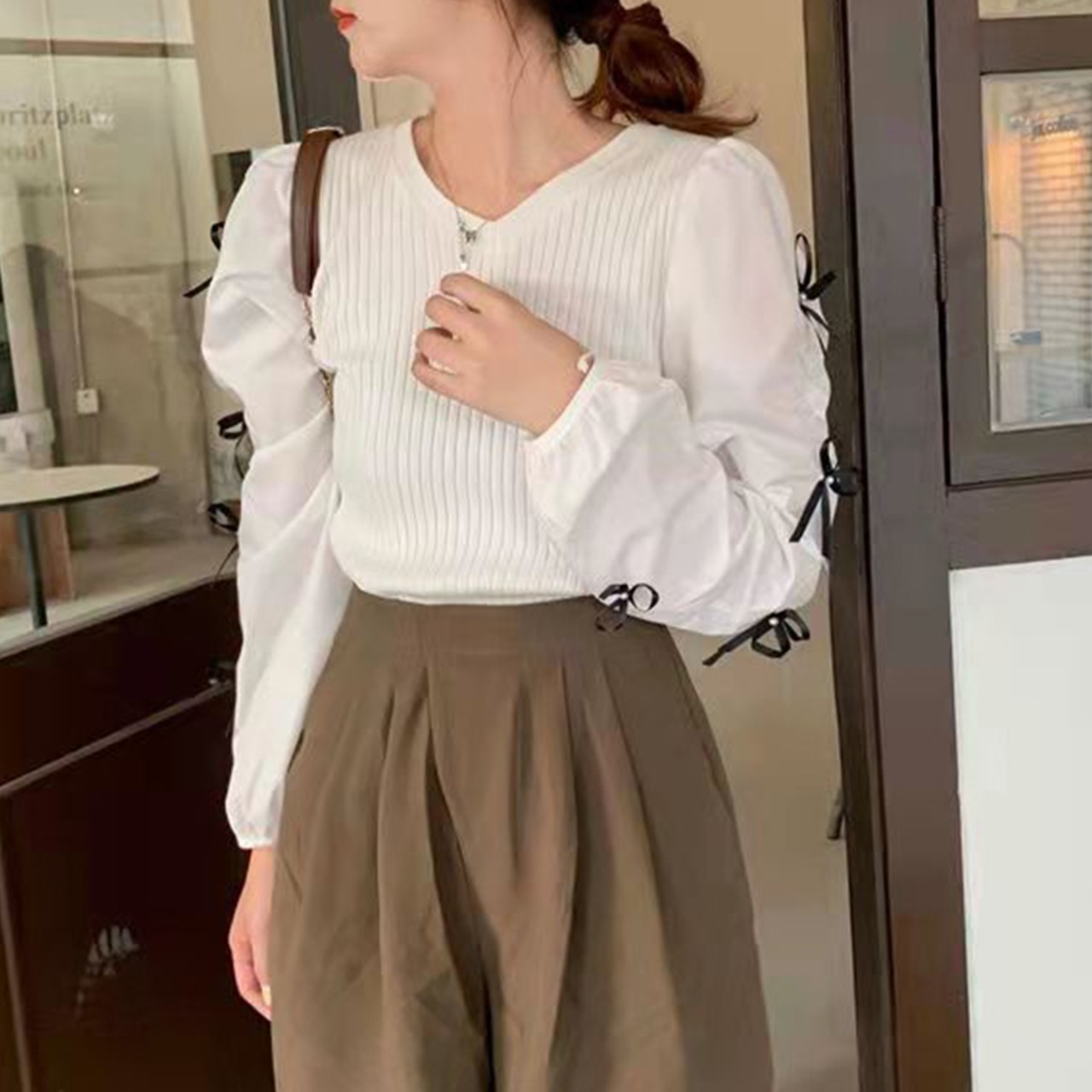 着やせ ブラウス 韓国風 リブニット 無地ニットトップス