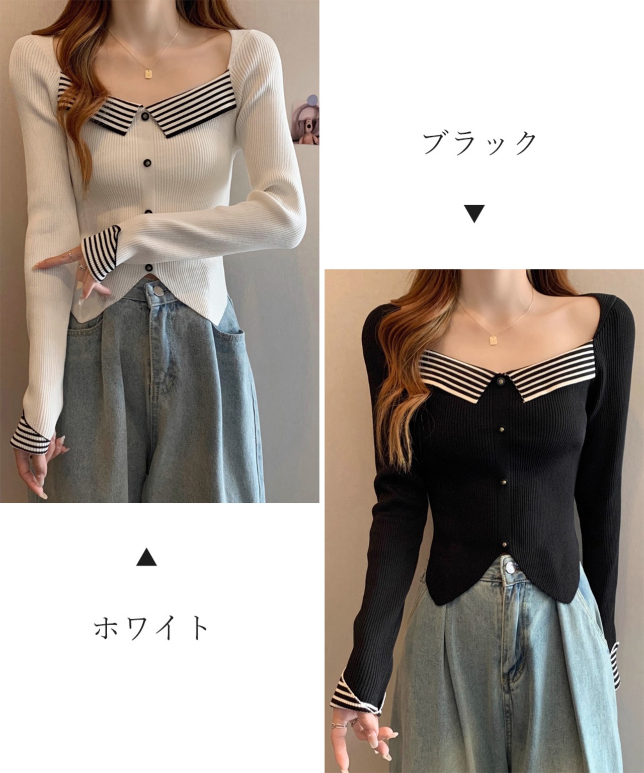 レディース 長袖 着やせ ニットウェア バイカラー フェイクボタンニット おしゃれ 普段着ニットセーター デコルテ美人