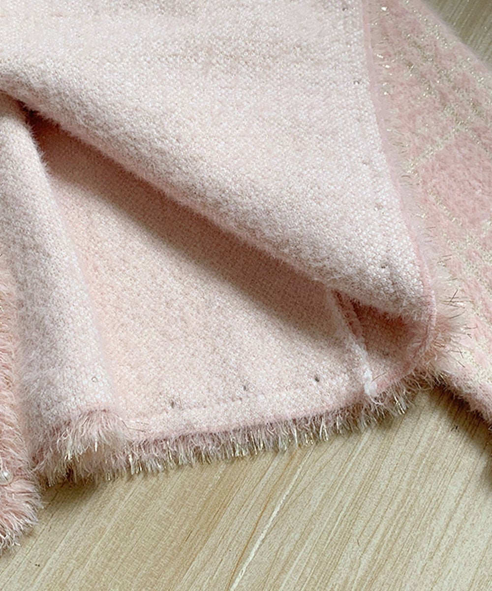ラメ糸を織り込んでいるので上品な輝きを放ち、縁にあしらったフリンジとフェイクパールボタンは清楚女子のフェミニンテイストをPLUS